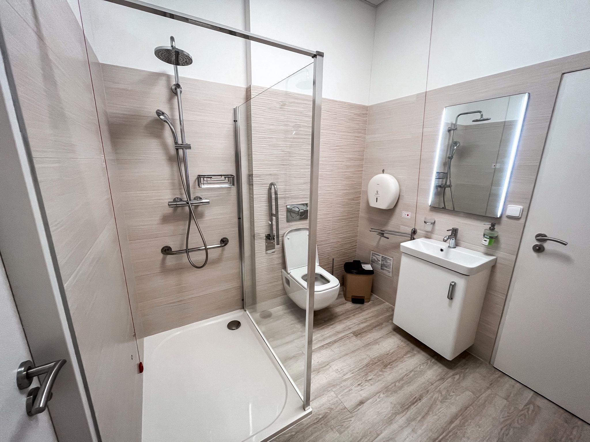 Rodička má možnost využívat sprchu k úlevě a tlumení bolestí. Hydroterapie, tedy pobyt v teplé vodě během první doby porodní, má uklidňující účinek, snižuje stres a napětí, uvolňuje svaly a vazy, a tím snižuje intenzitu kontrakcí.